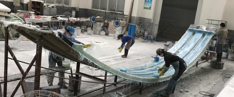 玻璃鋼拱形蓋板初步制作中(外表防紫外線藍色膠衣層)